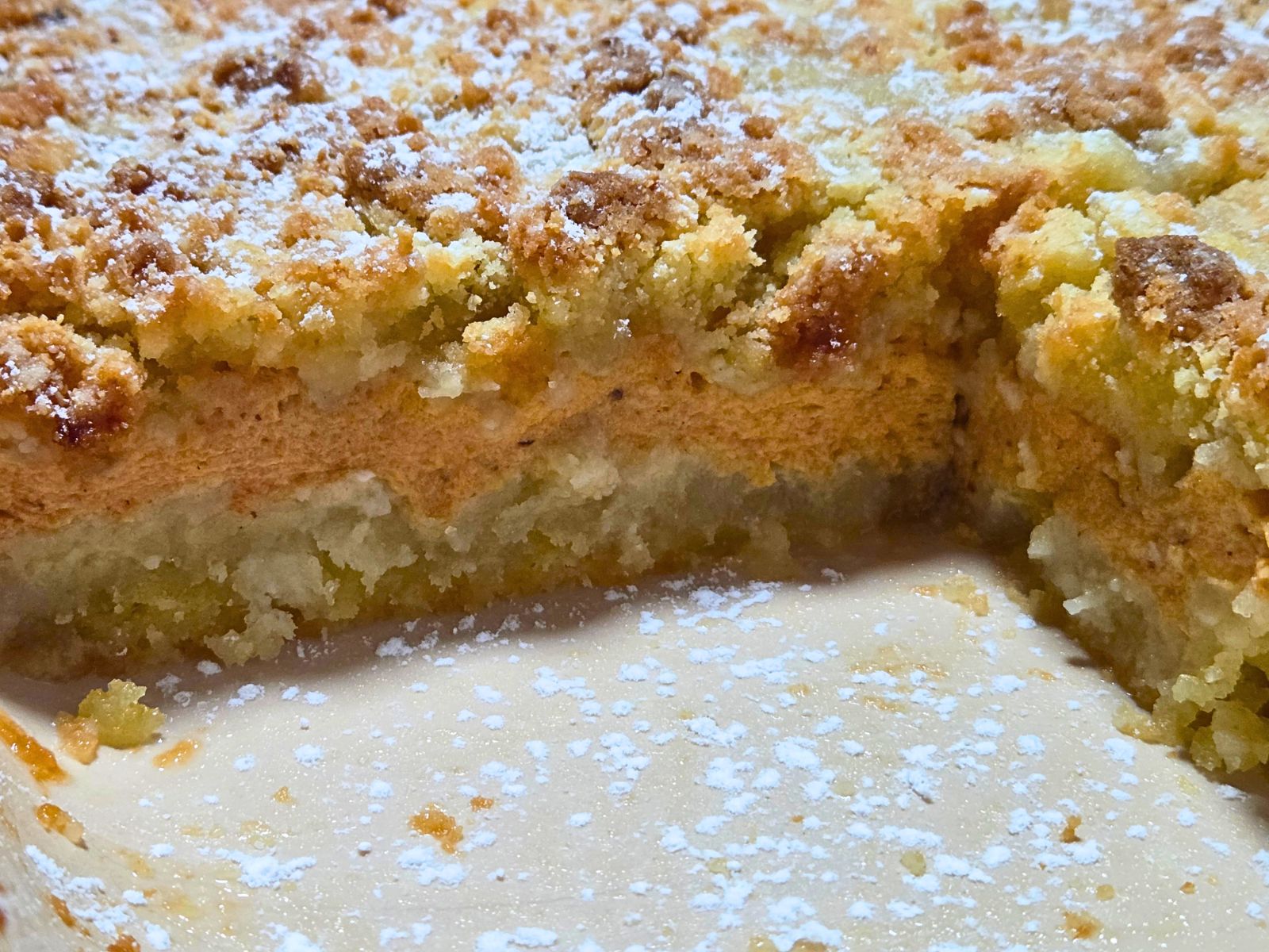 Pekač premažemo z maslom in nanj razdelimo polovico drobljenca in posujemo z mletimi orehi. Ostalo polovico prihranimo za dokončanje sladice.