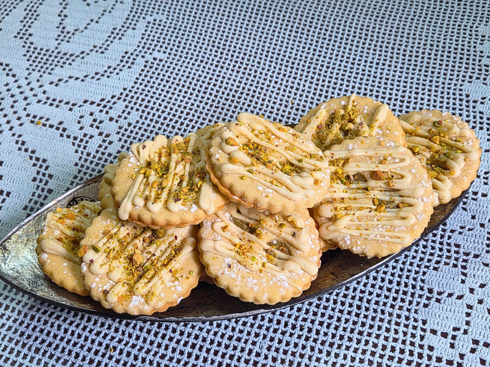 Pistacijev namaz dodamo na celi piškot in ga pokrijemo z izrezanim. Piškote posujemo z netopnim sladkorjem v prahu.