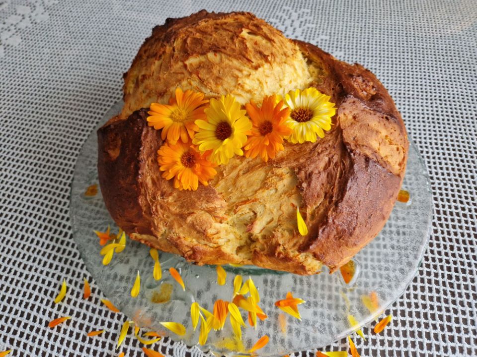 Premešamo in dodamo stopljeno maslo ter liste ognjičevih cvetov.